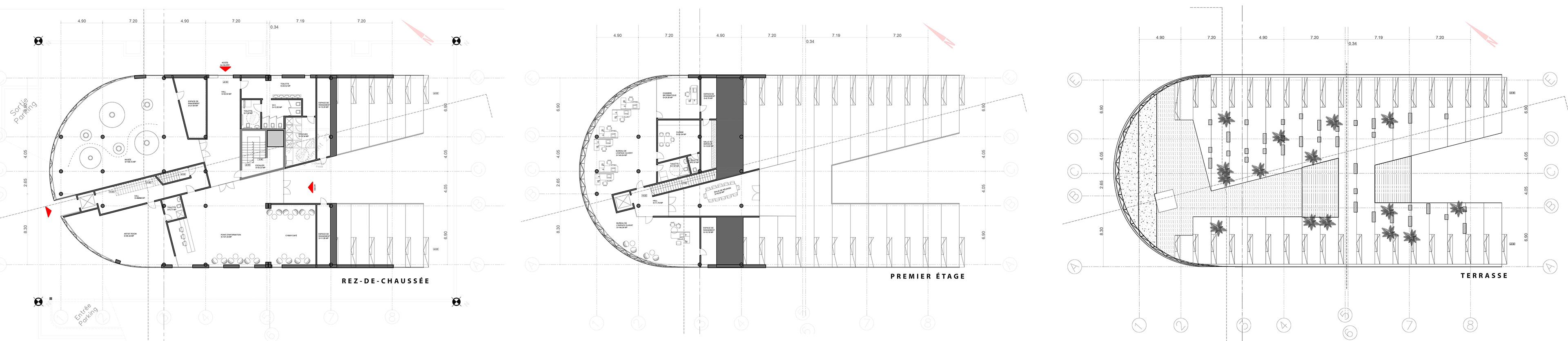 This building, for convenience, will be located near the parking lots and in the orthodromy of the port. Its architecture and organization will allow accessibility for all (terrace, harbor master's reception, and fishing hall), offering a balcony overlooking the sea, a pedestrian axis between the parking lots, the harbor master's office, the parking lot, the nautical pole called "cliff building" and the edge to the quay.